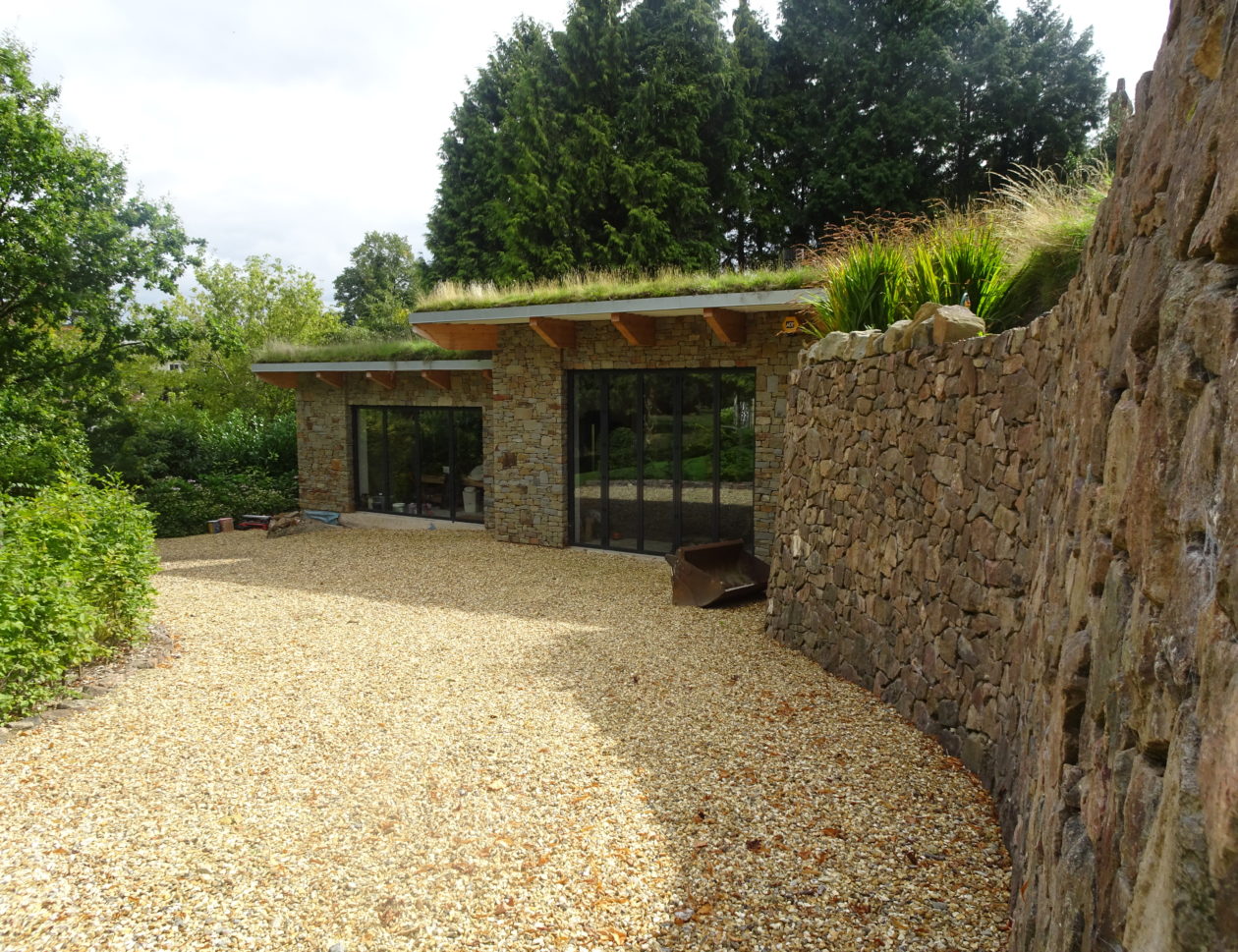 We worked with our customer, Leigh, to bring his vision to life for a Priory Road workshop. After grading off the ground to create new flat lawns and allow the workshop to be built, we constructed a series of retaining Malvern Stone walls with a dry stone look, clearing a route through to the structure. Once built, we clad the workshop in Forest of Dean stone to ensure it sat beautifully in the surrounding landscape, and topped off the driveway for a smart finish.